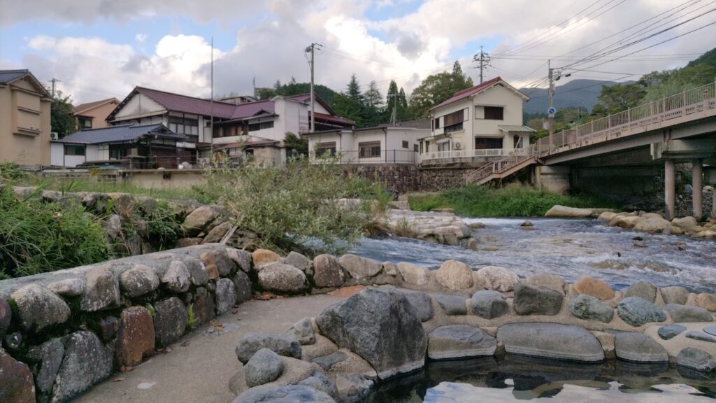 奥津温泉の清らかな渓流と足湯が楽しめます。